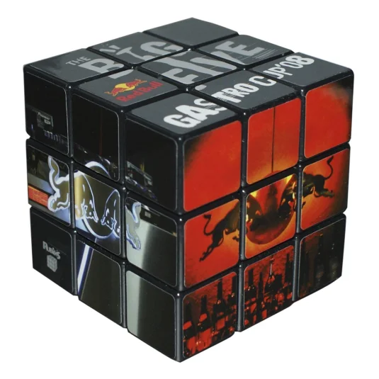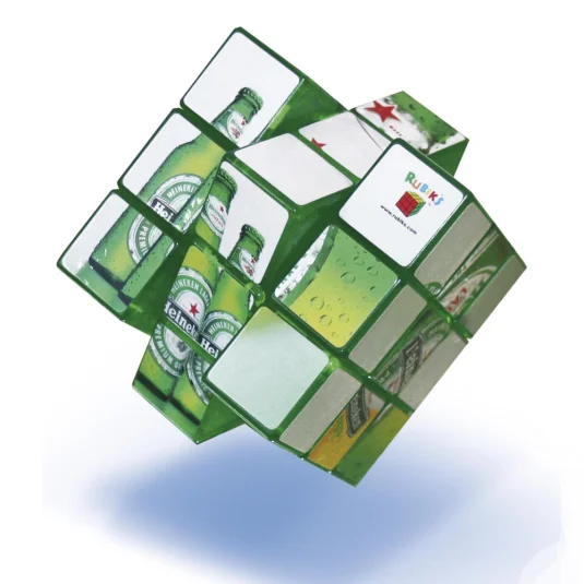 Das legendäre Geduldspiel! Zauberwürfel aus schwarzen Kunststoffblocks, jede Seite (3 x 3 = 9 Felder pro Seite) eignet sich für die mehrfarbige Umsetzung Ihrer Werbebotschaft, Mindestbestellmenge 100 Stück