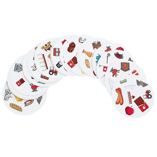 Swiss Made - ein lustiges, temporeiches Spiel voller Spannung, Spass und Action, jede Karte steckt voller bunter Symbole, nur wer blitzschnell kombiniert und das identische Zeichen zuerst erkennt, gewinnt!