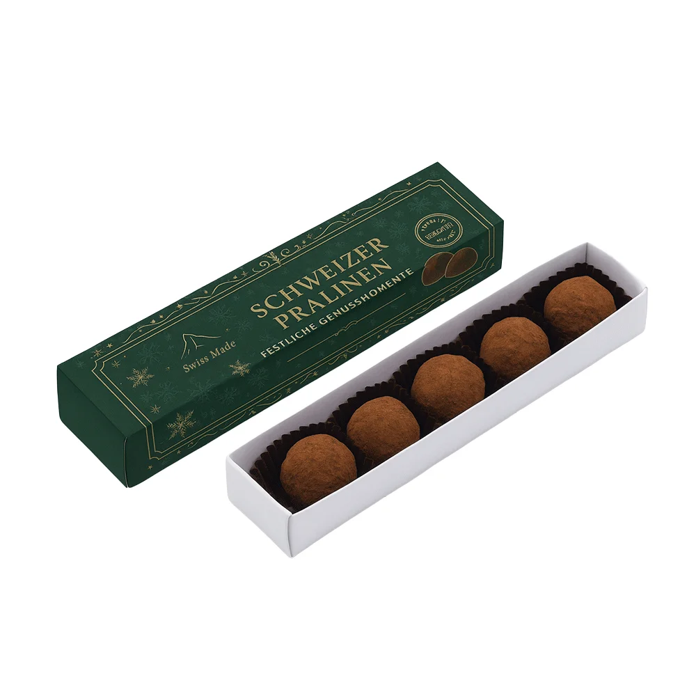 Festliche Genussmomente – Pralinenstange mit 6 klassischen Schweizer Bio-Truffes (ohne Alkohol; 2× Zartbitter, 2× Vollmilch, 2× Weiss), verpackt in einer hochwertigen Kartonbox mit praktischem Schiebedeckel, Haltbarkeit ca.