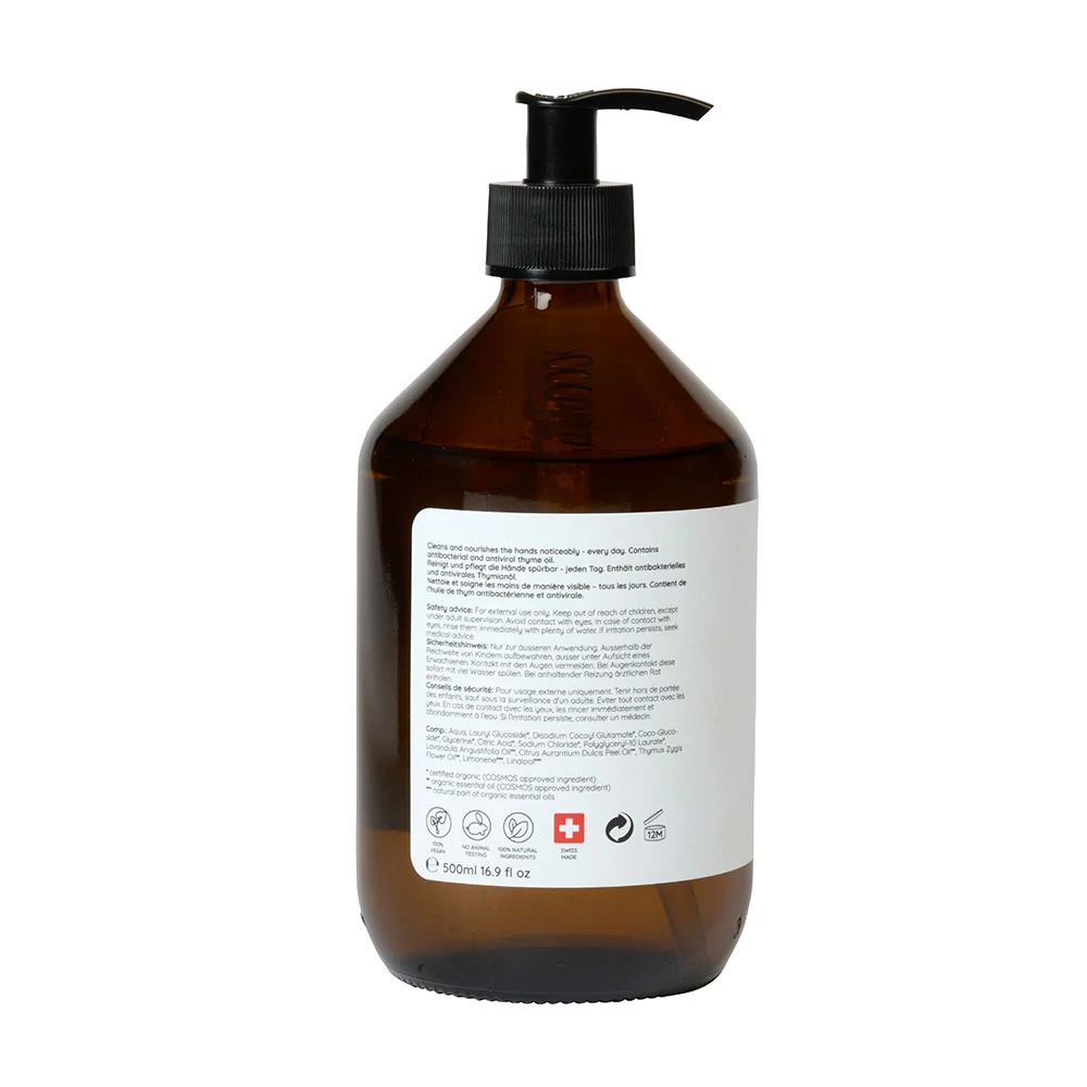 Swiss Made Handseife, aus 100 % natürlichen Inhaltsstoffen, pflegend und reinigend, natürlich antiviral und antibakteriell durch Thymianöl, mit angenehm natürlichem Duft, parfümiert mit biologisch angebauten ätherischen Ölen aus Pflanzen extrahiert, befüllt in dekorativer Glasflasche, Haltbarkeit ca.