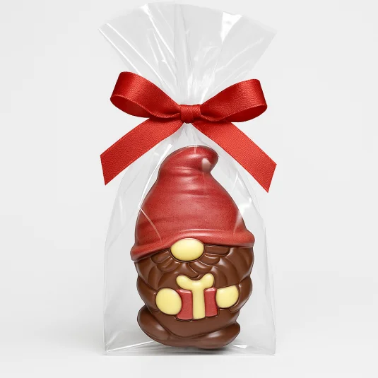 Festlicher Wichtel, hergestellt aus Grand-Cru-Madagascar-Bio-Vollmilchschokolade (38 %), geschminkt mit weisser Schokolade, verpackt im Cellophanbeutel mit roter Geschenkmasche, Haltbarkeit ca.