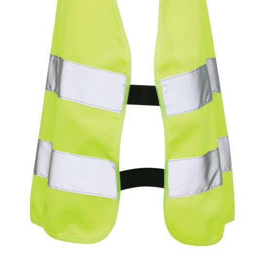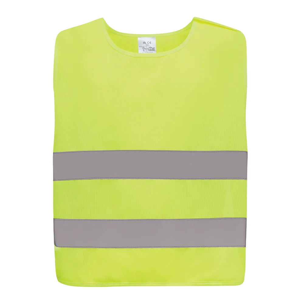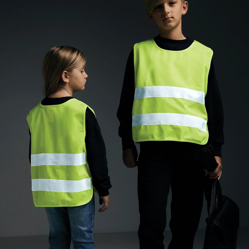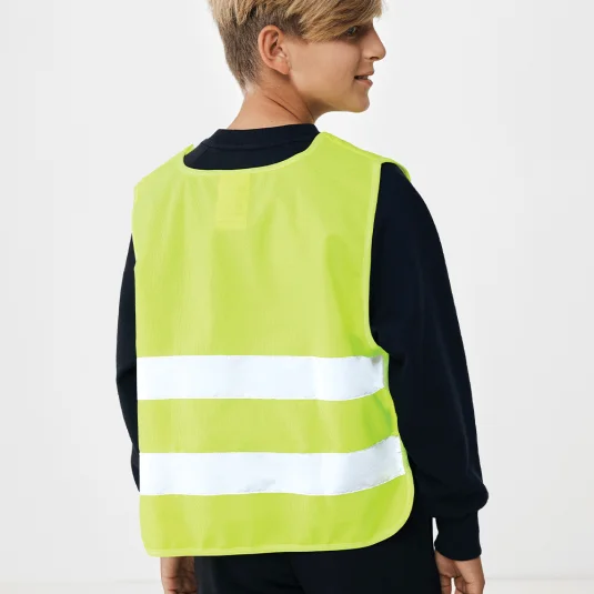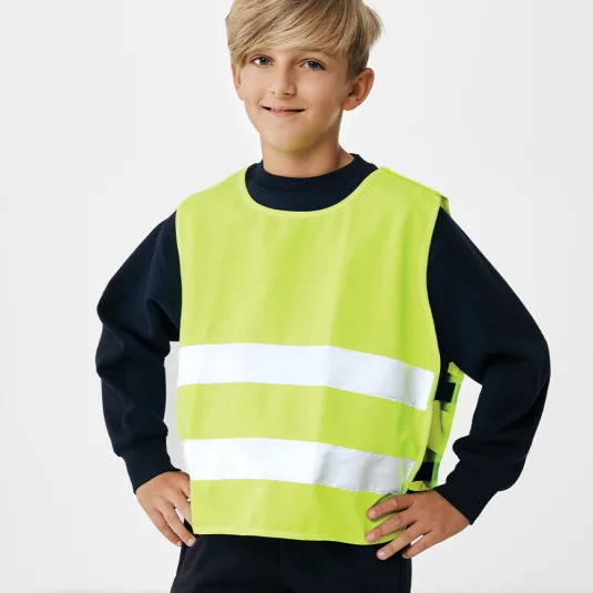 Kinder-Warnweste der Klasse 2 aus rezykliertem, zertifiziertem PET (67%), mit fluoreszierendem Hintergrund, reflektierendem Band sowie Klettverschlüssen an den Schultern und an der Unterseite, welche für zusätzliche Sicherheit und einfaches Anziehen sorgen, die elastischen Bänder sorgen für Flexibilität, so dass die Weste auch über dicken Jacken bequem getragen werden kann, ideal für Kinder im Alter von 7 - 12 Jahren (Körpergrösse 104 bis 125 cm)