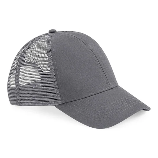 Trucker-Cap mit Vorderseite und Schirm aus Bio-Baumwolle, Mesh-Einsätze auf der Rückseite aus Polyester, 6-Panel-Design, strukturierte vordere Einsätze, vorgeformter Schirm, Snapback-Grösseneinsteller hinten.