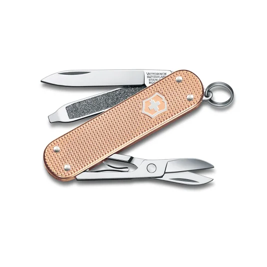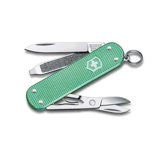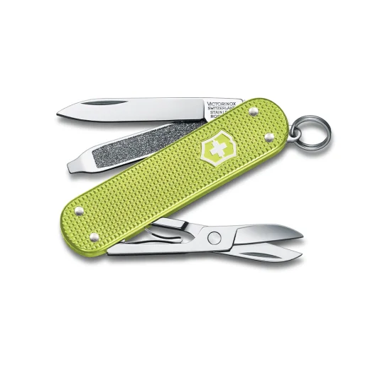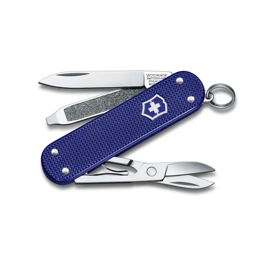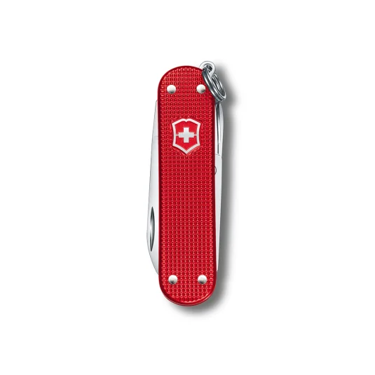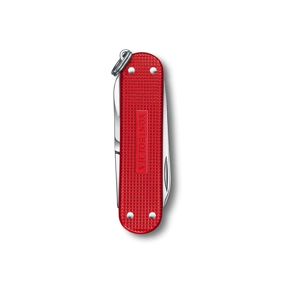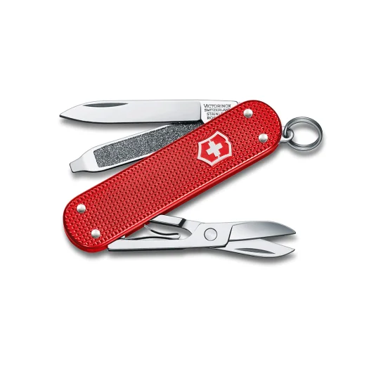 Kleiner Klassiker im Taschenformat - unentbehrlich für jeden Schlüsselbund! Swiss Made, aus dem Hause Victorinox; Taschenmesser aus hochwertigem, rostfreiem Stahl, Aluminium, Messing und Kunststoff, mit 5 Funktionen: Klinge, Nagelfeile mit Schraubendreher, Schere und Ring (Anhänger)