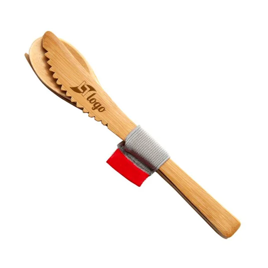 Nachhaltiges, 3-teiliges Besteckset aus Bambus, bestehend aus Gabel, Messer und Löffel, inklusive elastischem Band