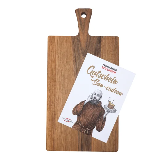 Geschenk-Set bestehend aus einem dekorativen Käse- und Schneidebrett aus hochwertigem, zertifiziertem Holz und einem Käse-Gutschein*
