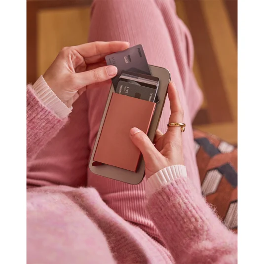 Das bewährte Original – mit zusätzlicher MagSafe-Kompatibilität! Eleganter Kartenhalter aus Aluminium, mit starkem Magnet zur Befestigung am Mobiltelefon (kompatibel mit den iPhone-Modellen 12 bis 16), zum sicheren Aufbewahren von 4 Kreditkarten mit oder 6 Kreditkarten ohne Prägung, schützt vollständig vor unbefugtem Auslesen von Daten auf RFID-Karten, hergestellt in Holland