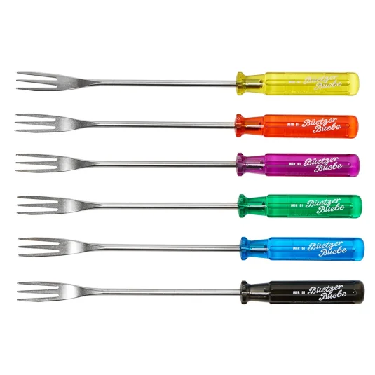 Für ein originelles und gemütliches Käsefondue! Unverwechselbar und im Original Schraubenzieher-Design, 6 glatte Gabeln aus rostfreiem Stahl mit Classic Griffen, auf Wunsch farblich sortiert oder assortiert (rot, gelb, grün, blau, violett, schwarz), lose geliefert