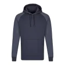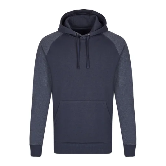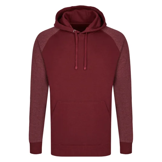 Moderner Hoody aus ringgesponnener Baumwolle, 3-teilige, doppellagige Kapuze für besseren Tragekomfort, flache Kordel, Kängurutasche, Ärmelabschlüsse und Bund aus 2x1 Ripp-Strick und Raglan-Ärmel.