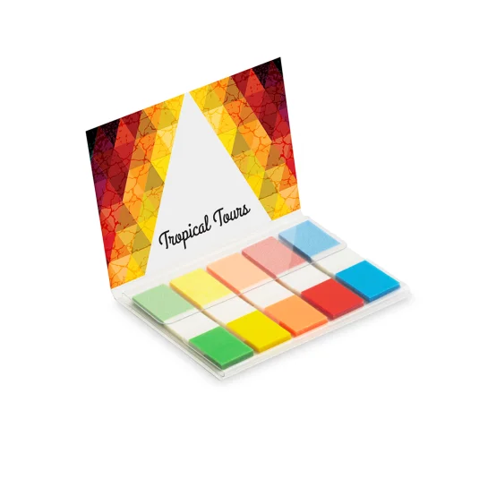 Halbtransparente Folienmarker (25 Blatt à 12 x 44 mm) in 5 verschiedenen Farben (rot, orange, gelb, grün, blau) im Karton-Softumschlag (250g/m2), Mindestbestellmenge 100 Stück