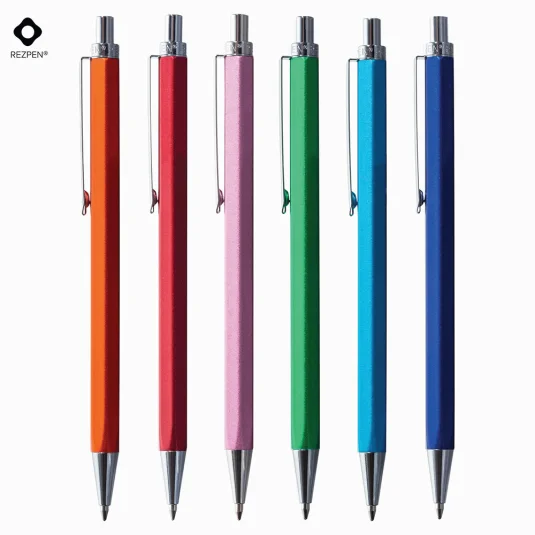 Swiss Design – ein hochwertiges, schlankes Schreibgerät mit nickelbeschichtetem Messingschaft und verchromten Beschlägen, ausgestattet mit einer Metall-Grossraum-REZPEN®-Mine (blau), die auf Schweizer Präzisionsmaschinen gefertigt wird und eine Schreiblänge von über 5'000 Metern bietet