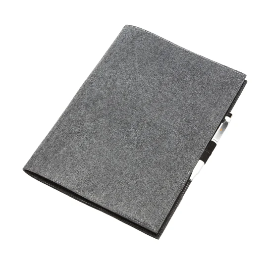 Innovative Schreibmappe aus rezykliertem Filz, mit diversen praktischen Fächern, zum Beispiel für Schreibblock, Stifte, Visitenkarten etc.