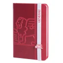 Originelles, individuell gestaltetes Notizbuch, Material Tucson, Elastikband und Stiftschlaufe in individueller Farbe (Pantone) mit Aufdruck, Lanybutton mit Geldoming, Blindprägung auf Deckel