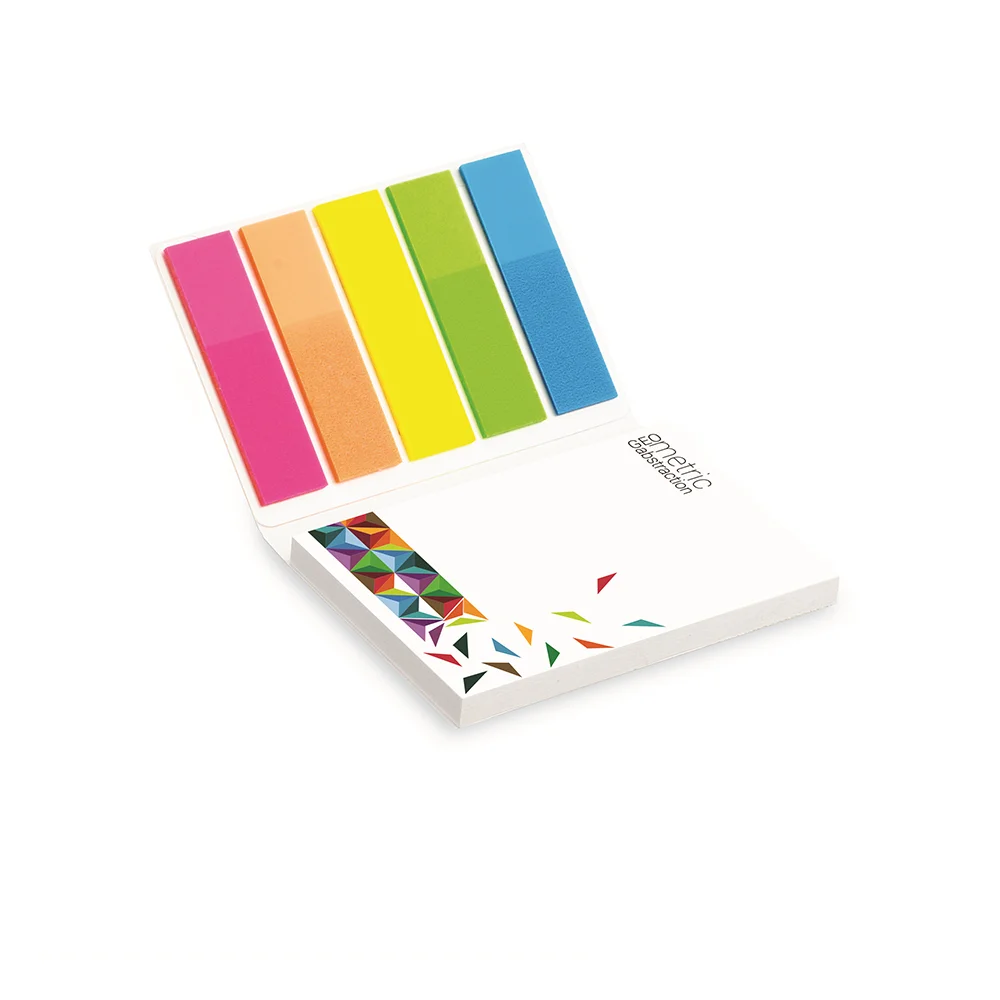 Praktisches Set im Softumschlag (250g/m2), mit Haftnotizblock (50 Blatt à 50 x 72 mm, 80g/m2), sowie PET-Folienmarker in 5 verschiedenen Farben (blau, grün, gelb, rosa, orange - je 20 Blatt à 12 x 45 mm, 60 g/m2)), Mindestbestellmenge 100 Stück