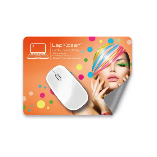 Praktisches, superdünnes Pad mit 3 Funktionen; Displayschutz für Notebooks, Mousepad (Rückseite mit RDX Anti-Slip-Beschichtung) und Display-Reinigungstuch (Vorderseite aus Microfaser P-9000®HD)