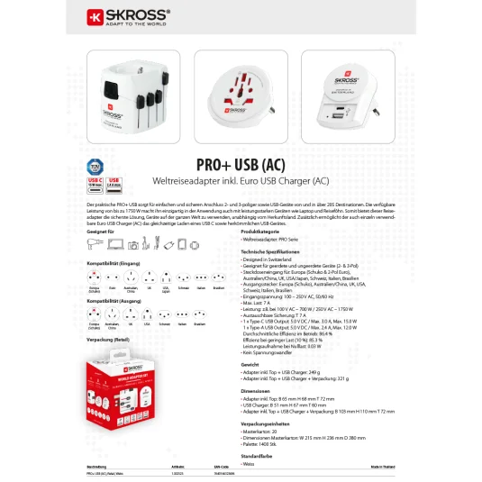 Designed in Switzerland - kraftvoller 3-poliger Weltreiseadapter PRO + USB (A&C) bietet eine 2in1 Lösung: Reisende aus aller Welt können ihre 2- und 3-poligen Geräte, auch Laptop und Reisefön, in über 205 Ländern auf sicherste Weise anschliessen, zusätzlich bietet das aufsteckbare und auch einzeln verwendbare duale USB Top eine leistungsstarke USB Ladeverbindung   Technische Spezifikationen: - Designed in Switzerland - Geeignet für geerdete und ungeerdete Geräte (2- & 3-Pol) - Für Geräte aus: Europa (Schuko & 2-Pol Euro), Australien/China, UK, USA/Japan, Schweiz, Italien, Brasilien - Für folgende Steckdosenstandards: Europa (Schuko), Australien/China, UK, USA, Schweiz, Italien, Brasilien - Eingangsspannung: 100 V – 250 V - Max.