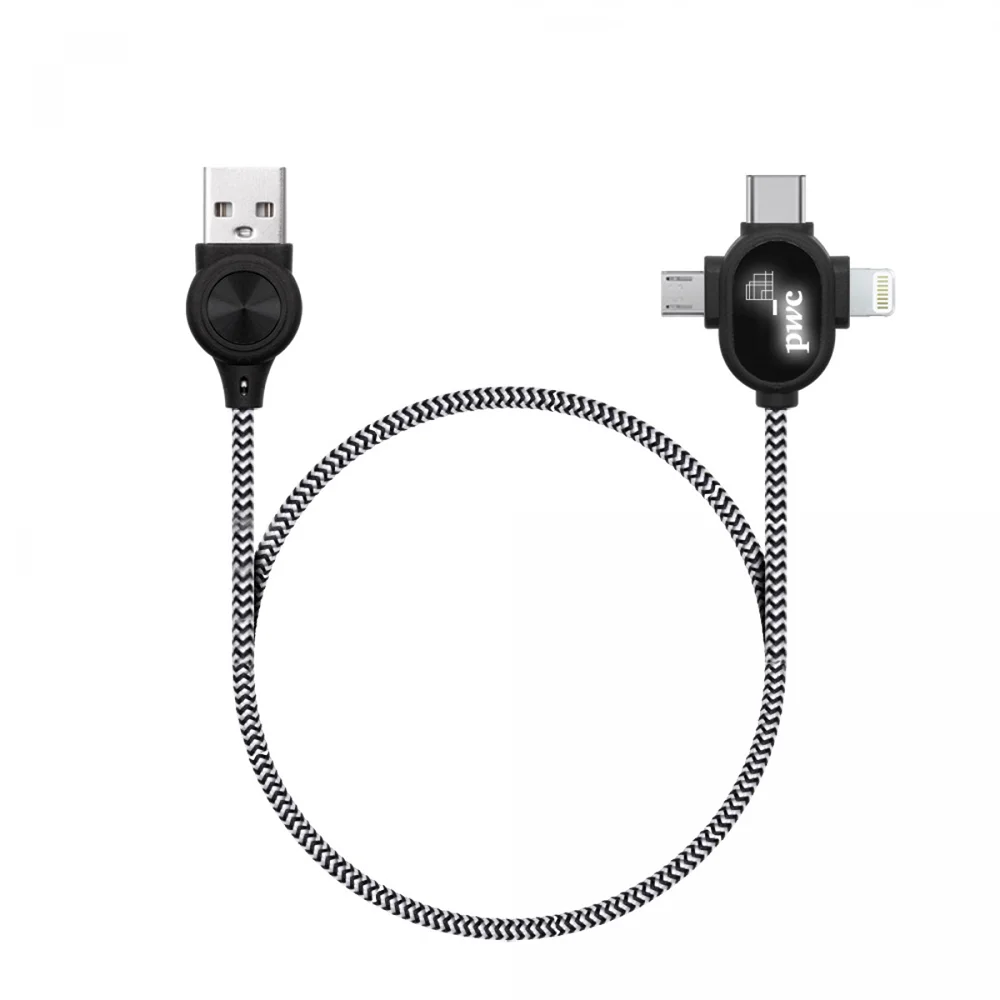 Hochwertiges 3-1 Ladekabel aus Nylon geflochten, ausgestattet mit Lightning-, Micro-USB-, Type-C- und USB-Anschluss, für alle Geräte einsetzbar, wird in Polybeutel geliefert, Mindestbestellmenge 500 Stück