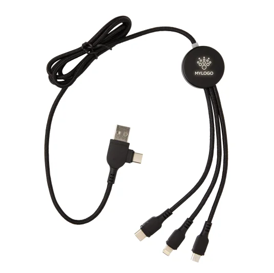 Multi-Ladekabel aus Kunststoff und Nylon, mit Logo-Leuchteffekt während der Verwendung, kompatibel für Type-C-in, USB-A-in, Type-C-out, iOS-out sowie Micro-USB-out Anschlüssen, zudem eine USB A-Output-Input-Funktion, mit der jedes Gerät von jeder Ausgangsquelle aufgeladen werden kann, Kabellänge 120 cm