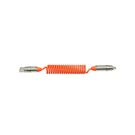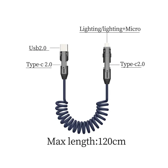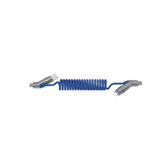 Dehnbar, effizient und schnell - All-in-One Ladekabel mit Lightning-, Android Micro-USB, sowie Type C-C (240W) Anschluss, Mindestbestellmenge 100 Stück