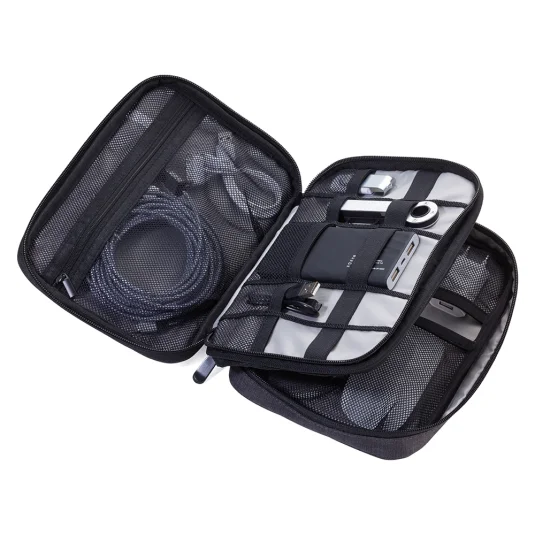 Ordnung im digitalen Zubehör! Elegante Tasche aus Polyester, mit diversen Reissverschluss- und Innenfächern, einem Aussenfach, sowie einer robusten Schlaufe für die Befestigung am Reise-Trolley