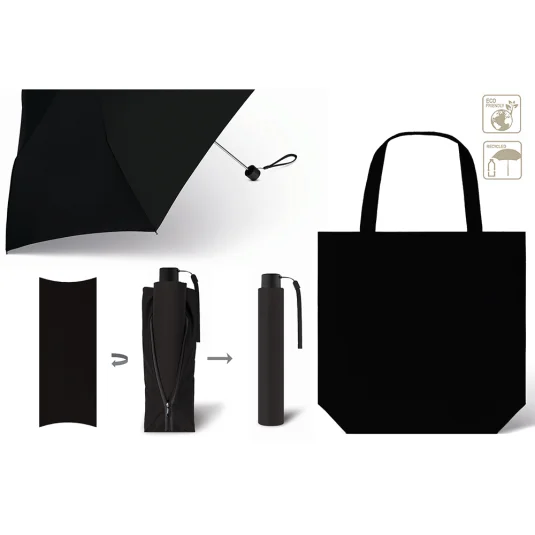 2in1 - nachhaltiger, robuster Mini-Schirm mit praktischer Reissverschluss-Hülle, welche jederzeit zu einer Einkaufstasche umgewandelt werden kann, mit praktischem Schirmfach zum trockenen und sicheren Verstauen des nassen Schirms, beides aus hochwertigem Polyester Pongee aus rezykliertem Material, mit stabilem Stahlgestell mit Windproof-Funktion