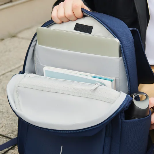 Stylischer Rucksack aus wasserabweisendem rezykliertem PET, mit diebstahlsicherem Klappdeckel und zusätzlich geschützten Reissverschlüssen, einem RFID-geschützten Fach für garantierten Schutz vor Datendiebstahl sowie einem 16"-Laptopfach, Inhalt 15 l