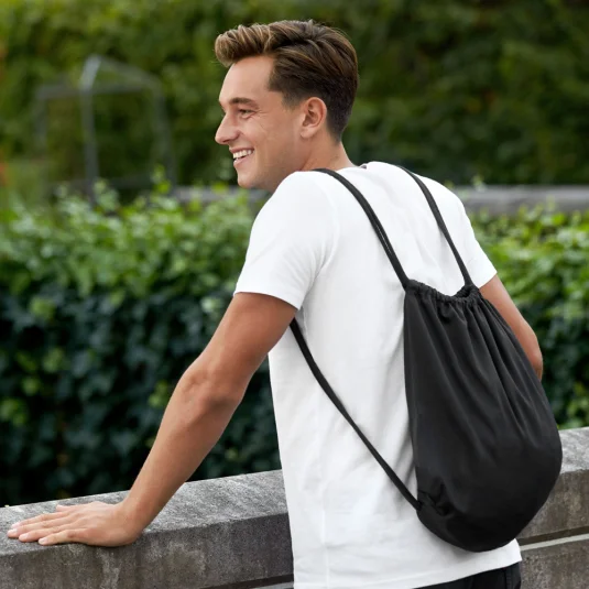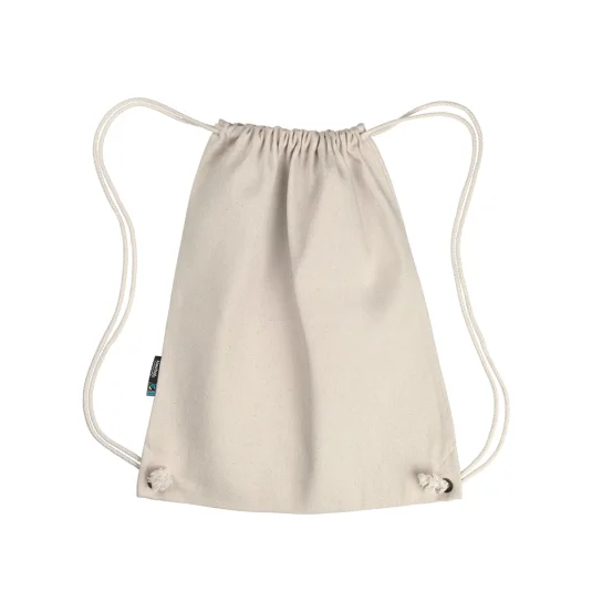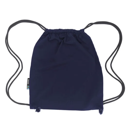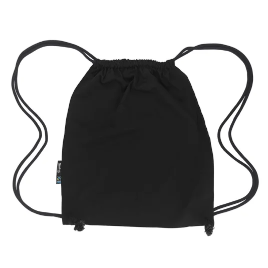 Fairtrade-zertifizierter Gym Bag aus gekämmter Bio-Baumwolle, Twill Gewebe, schwere Kordelzüge, Neutrales und Fairtrade-Flaglabel an der Seite