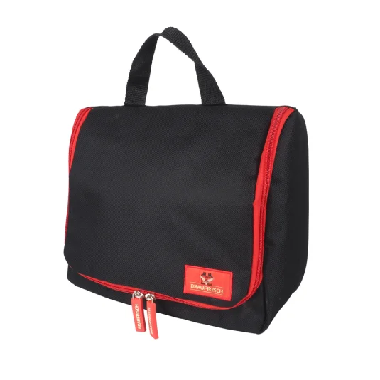 Umweltfreundlicher Kulturbeutel aus rezykliertem PET-Material (600D rPET), aufklappbar, mit Metallhaken zum Aufhängen, innen mit diversen Fächern und Unterteilungen, Mindestbestellmenge 300 Stück