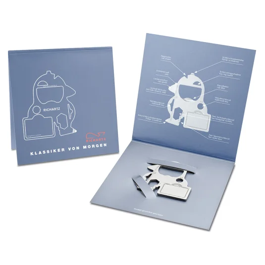 Small multifunctional tool made of high-quality, matt blasted stainless steel, with 14 practical functions; bottle opener, slotted screwdriver, Phillips screwdriver, two hexagon spanners, centimetre ruler, inch ruler, paint can opener, nail puller, two multi-tooth spanners, two spoke spanners and a ring loop