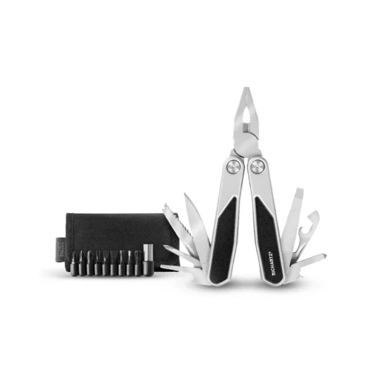 Perfection and precision! Professional multifunctional tool made of stainless steel and anodised aluminium, with a wide range of functions: Pliers, wire cutter, file, slotted screwdriver, can opener, bottle opener, slotted screwdriver, Phillips screwdriver, saw, large blade, glass breaker and bit set with 9 bits