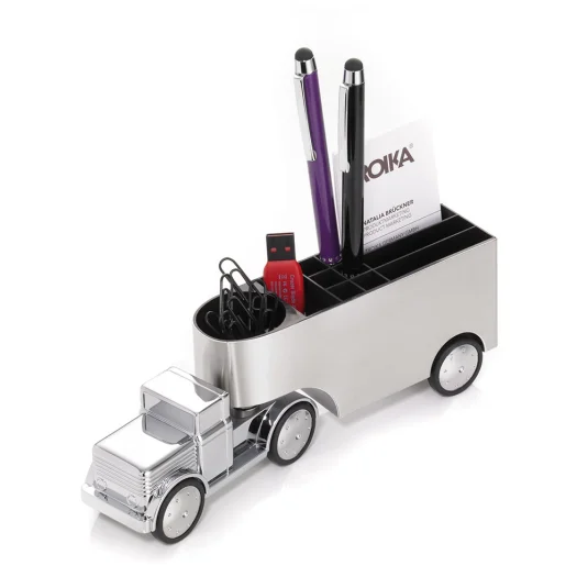 Paperweight and pen holder of chromed metal with magnet for paper clips, pull-out mechanism, incl.