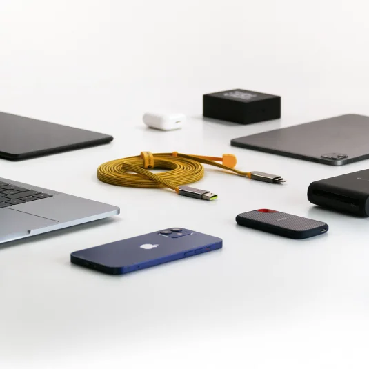 Innovative "Ultra Fast Charging" charging cable with metal housing and aramid fibre with fast charging capacity of up to 100W from USB-C to USB-C and up to 18W when charging Apple devices, supports both charging and data transfer at a speed of 480 Mbit, contains USB A/USB C Male to Lightning/Micro-USB A/USB C Male connector