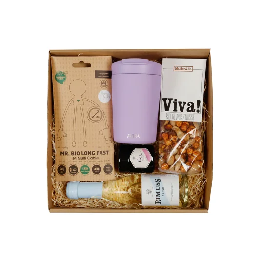 Welcome to our team! Decorative box filled with various high-quality products: - 1 Eco multi-charging cable Mr Bio long (made from sustainable materials)- 1 BIO spiced nuts from Mahler & Co (140 g)- 1 Rimuss Piccolo non-alcoholic (2 dl)- 1 coffee-to-go cup (3 dl)- Blossom honey from Bee Family (70 g) Other variants and products available (prices on request)