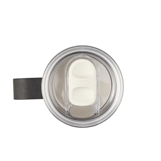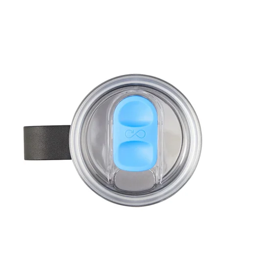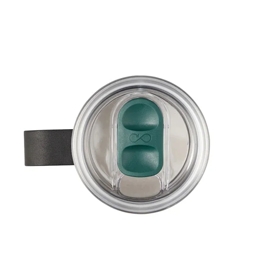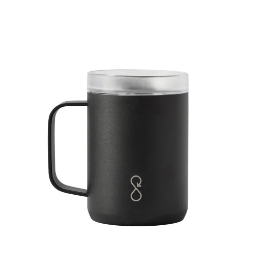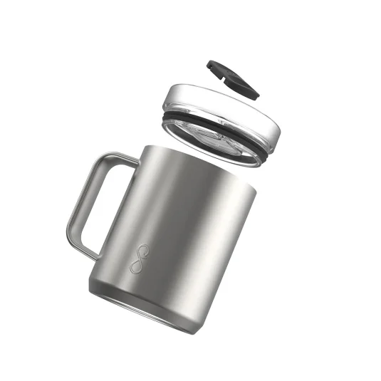 Stop Ocean Plastic! Double-walled, vacuum-insulated travel mug made of 90% recycled stainless steel, keeps drinks warm for up to 4 hours or cool for up to 10 hours, with ergonomic handle and removable lid made of recycled plastic (67%) with sliding closure, capacity 0.35 litres