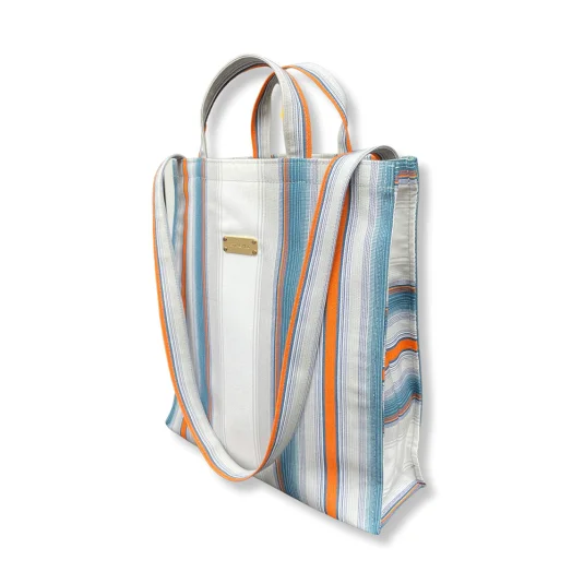 Swiss Made & Upcycled! Sustainable, durable shopping bag, made from old, local and water-resistant sun blinds, handmade with great care as a unique item in non-profit Swiss foundations