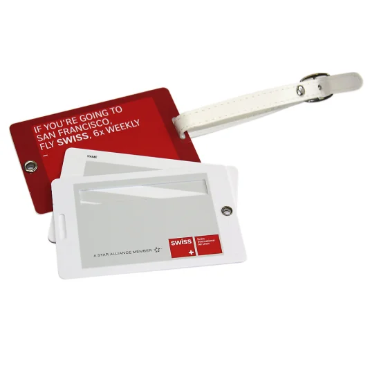 Plastic suitcase label, address field inside, with artificial leather band and buckle closure, packed singly in polybag