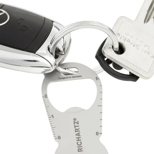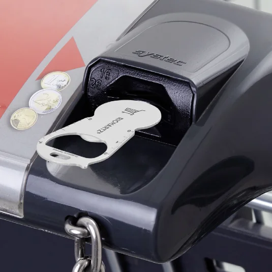 Shopping trolley remover for the key ring made of stainless steel, with additional practical functions; bottle opener, centimetre ruler and screwdriver