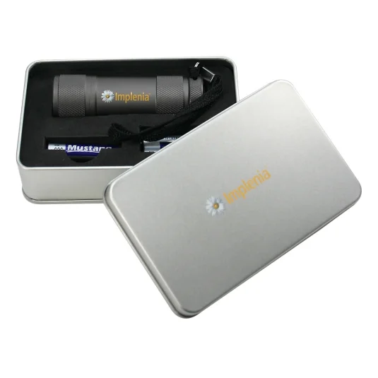 Small power lamp of anodized aluminum, with 9 LED lights for very bright light, delivered in attractive tin box