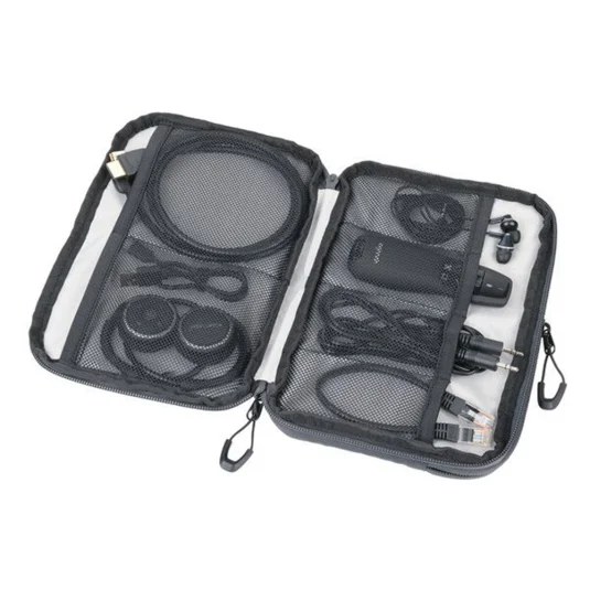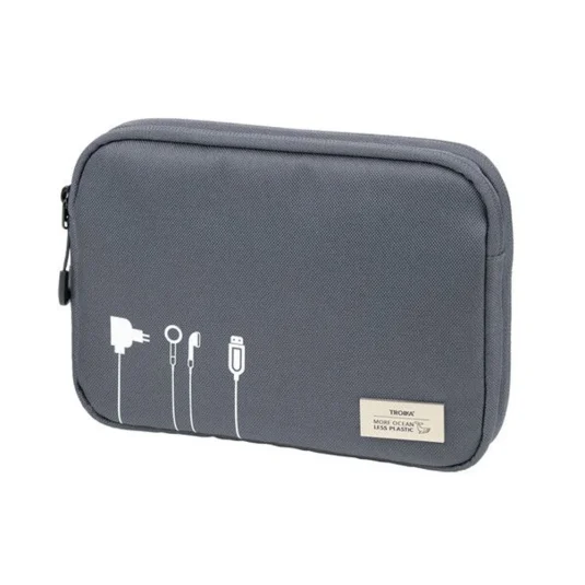 Practical, hard-wearing bag for electronic accessories, made from recycled marine plastic, 1 compartment with 2-way zip and 6 mesh pockets