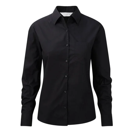 Long-sleeved blouse with classic one-button collar, tone-on-tone buttons, V-shaped breast pocket on the left, cuffs adjustable with two buttons, classic cut, rounded hem, easy-care