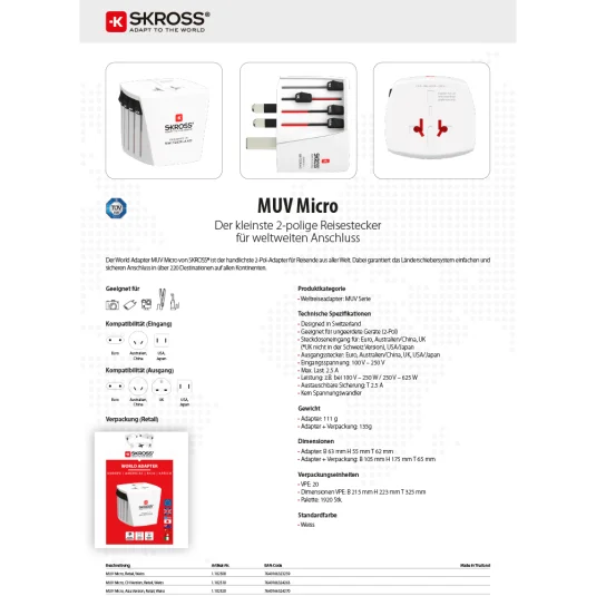 The World Adapter MUV Micro is the smallest 2-pole adapter for travelers from all over the world