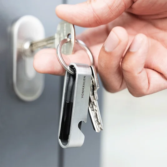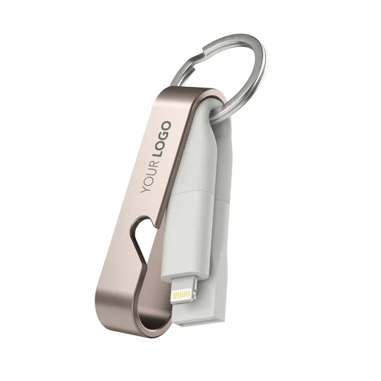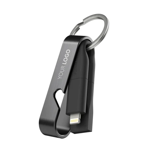 Innovative, multifunctional USB fast charging cable HIGH SIX® made of stainless steel, plastic and recycled copper, for charging all mobile devices, the practical bottle opener also serves as a protective cover for the cable, with key ring Colouring of cable and adapter according to Pantone possible from 500 pieces (prices on request) Adapter: USB-A, 2in1 connector (Micro-USB / compatible with iPhone / iPad) Connector: 2× USB-C Charging speed:- USB-C to USB-C: 3 A (60 W)- USB-C to Lightning: 2.