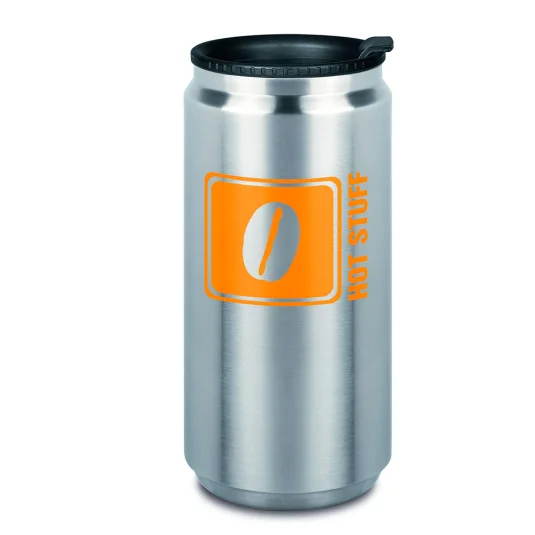 Funny vacuum-insulated thermal mug in the shape of a drink can, of double-walled stainless steel, with practical drinking lid