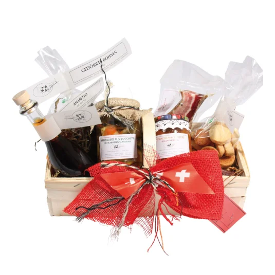 Woven basket filled with: 1 bottle Amaretto (contents 2 dl), 1 cellophane bag of "Chrömli" cookies (contents: 200g), 1 cellophane bag of dried beans (contents 100g), 1 smoked bacon (weight approx.