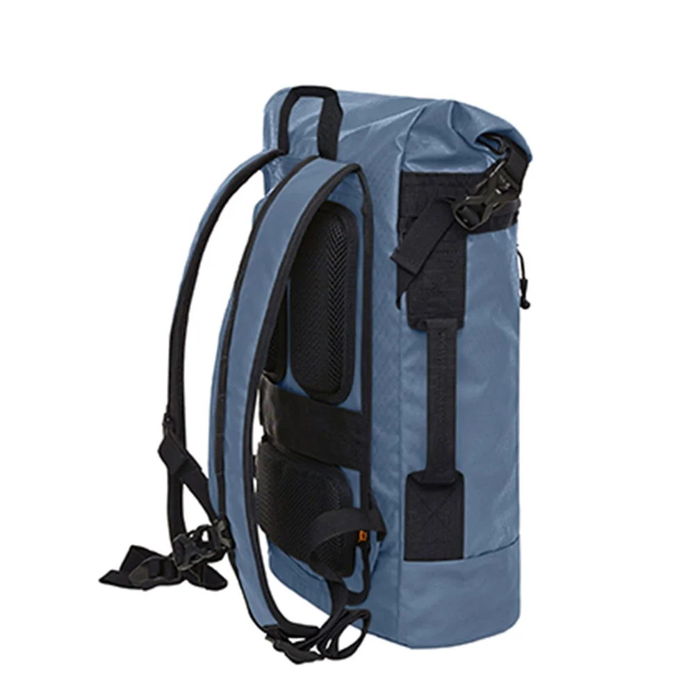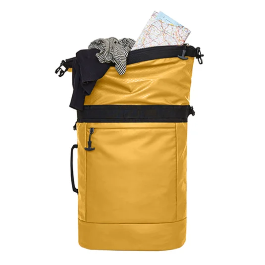 Stylish roll-top backpack made from recycled PET, with large zipped main compartment, padded slip-in compartment for up to 15’ laptops, hidden anti-theft compartment, loop for attaching to trolleys, padded shoulder straps and additional handle on the side