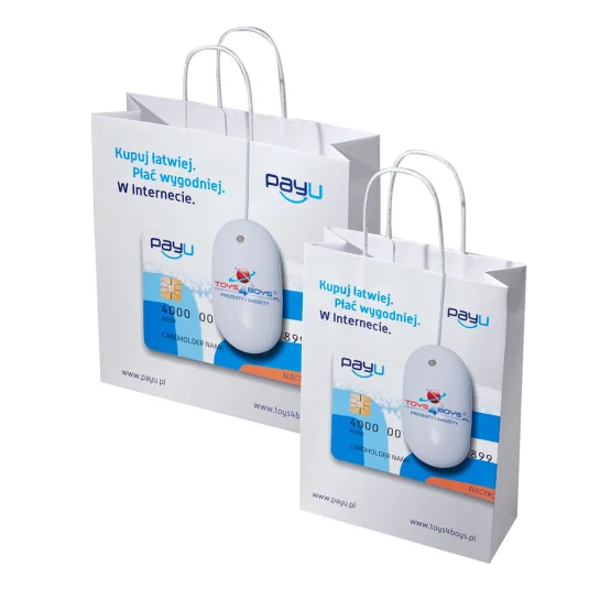 Sac en papier kraft FSC 170 g/m2 (revêtement mat ou brillant disponible), avec cordons en papier tressé, revers renforcé et fond en carton, également disponible en d’autres tailles (prix sur demande), commande min 500 pièces