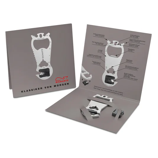 Outil multifonctionnel compact en acier inoxydable de qualité supérieure, sablé mat, avec 14 fonctions ; ouvre-lettres et ouvre-paquets interchangeables, 1 lame de rechange click-in, décapsuleur, tournevis plat, tournevis cruciforme, deux clés à rayons, trois clés hexagonales, clé multi-dents, arrache-clous, centimètre, pouce et œillet pour porte-clés