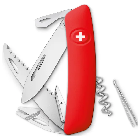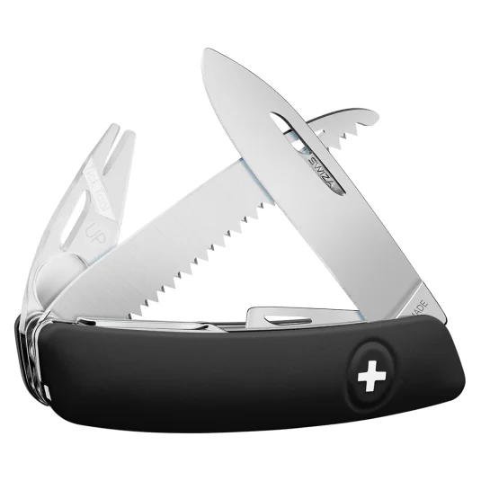 Fonctions: Scie, extracteur de tiques avec loupe, couteau, fil de perçage et de perforation avec chas d'aiguille, décapsuleur avec tournevis n ° 3 et chas d’aiguille, tire-bouchon, pince à épiler