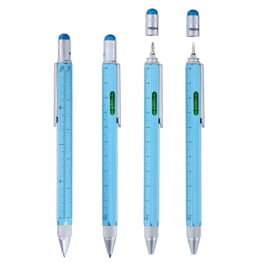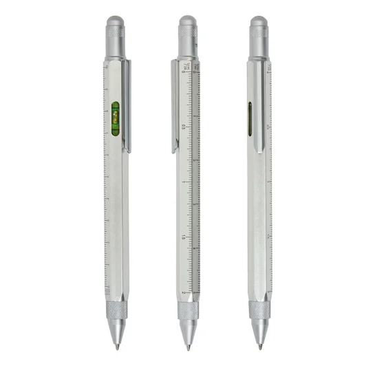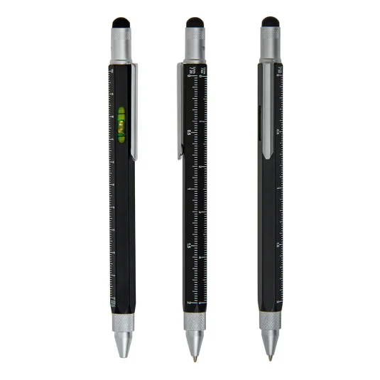 All in one ! Stylo-bille multifonction unique en laiton, avec 4 graduations en centimètres différentes (1 : 20, 1 : 25, 1 : 50, 1 : 100), niveau, tournevis plat et cruciforme et stylet avec mine noire