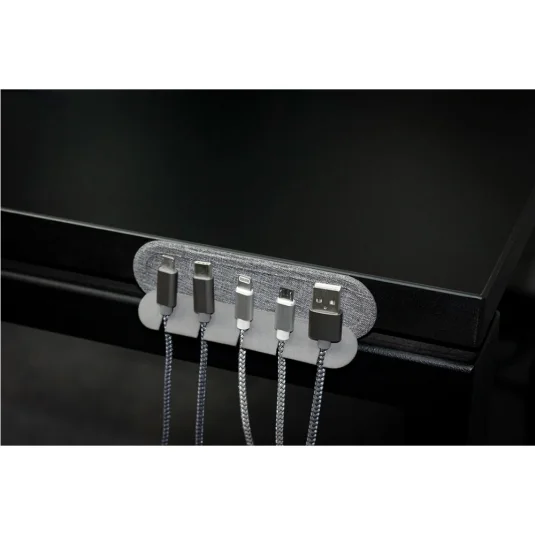 De l'ordre dans la salade de câbles ! Organisateur de câbles pratique en rPET durable, compatible avec tous les câbles de chargement et périphériques d'une épaisseur allant jusqu'à 6 mm, avec surface adhésive 3M pour fixer le dock sur toute surface lisse